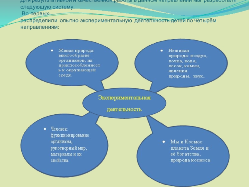 Экспериментирование – эффективный метод познания закономерностей и явлений окружающего мира. Оно включает в себя активные поиски решения задач, выдвижение предположений, реализацию выдвинутой гипотезы в действии и построение доступных выводов .В процессе эксперимента идет обогащение памяти ребенка, активизируются его мыслительные процессы, так как постоянно возникает необходимость совершать операции анализа и синтеза, сравнения, классификации и обобщения, познания закономерностей и явлений окружающего мира.