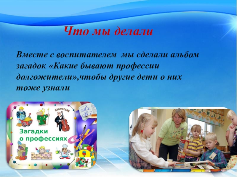Что мы делалиВместе с воспитателем мы сделали альбом загадок «Какие бывают профессии долгожители»,чтобы другие дети о них