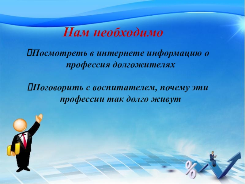 Нам необходимоПосмотреть в интернете информацию о профессия долгожителяхПоговорить с воспитателем, почему эти профессии так долго живут