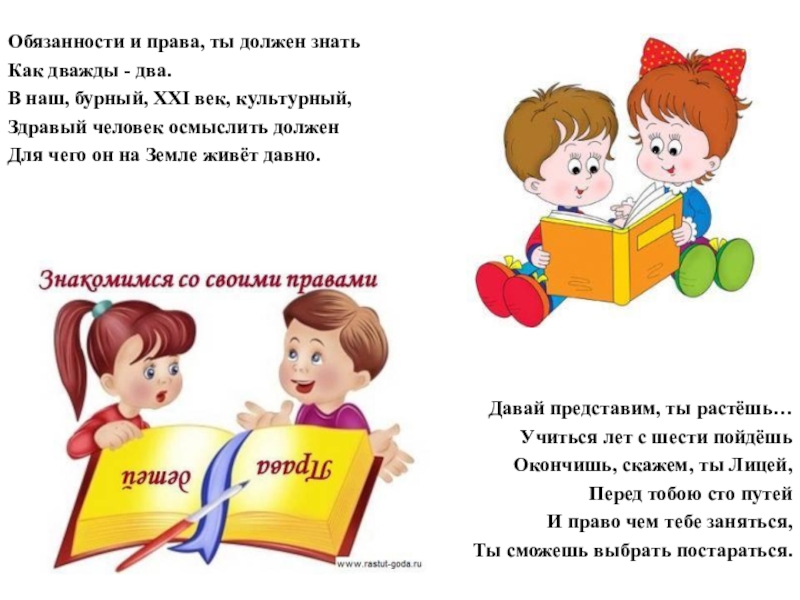 Обязанности и права, ты должен знатьКак дважды - два.В наш, бурный, XXI век, культурный,Здравый человек осмыслить долженДля чего он на Земле живёт давно.