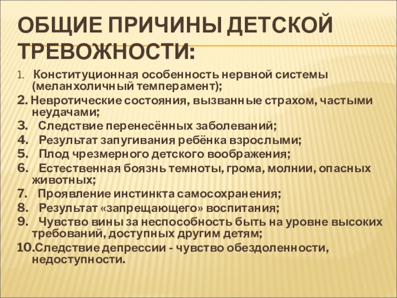 ОБЩИЕ ПРИЧИНЫ ДЕТСКОЙ ТРЕВОЖНОСТИ:1.    Конституционная особенность нервной системы (меланхоличный темперамент);2. Невротические состояния, вызванные страхом, частыми неудачами;3.    Следствие