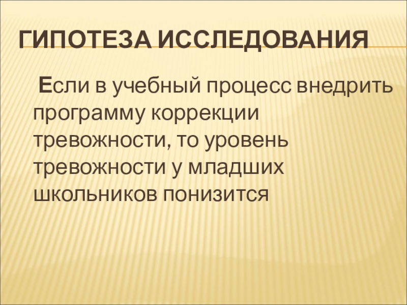 ГИПОТЕЗА ИССЛЕДОВАНИЯ	Если в учебный процесс внедрить программу коррекции тревожности, то уровень тревожности у младших школьников понизится