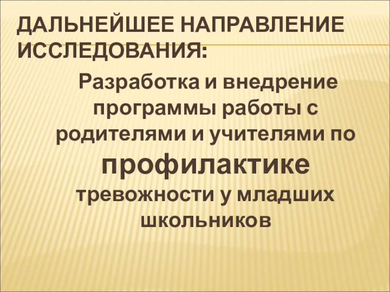 ДАЛЬНЕЙШЕЕ НАПРАВЛЕНИЕ ИССЛЕДОВАНИЯ:	Разработка и внедрение программы работы с родителями и учителями по профилактике тревожности у младших школьников