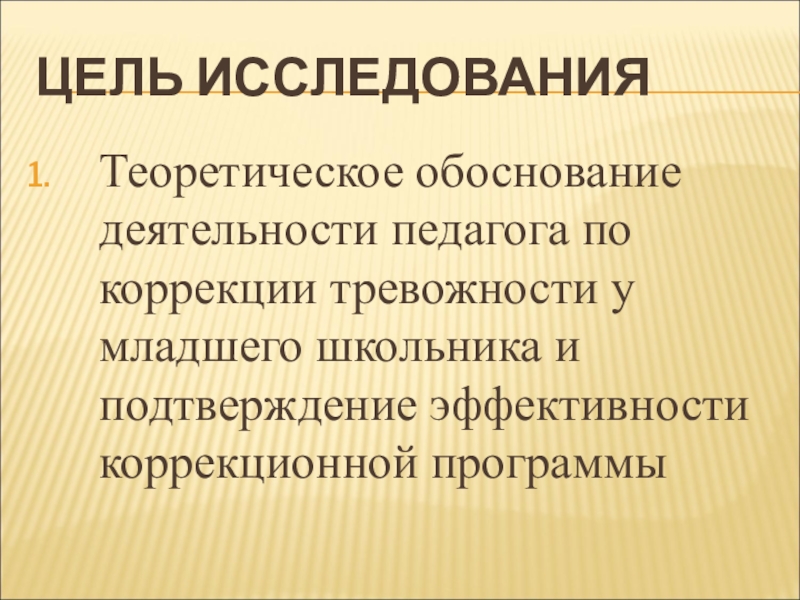 ЦЕЛЬ ИССЛЕДОВАНИЯТеоретическое обоснование деятельности педагога по коррекции тревожности у младшего школьника и подтверждение эффективности коррекционной программы