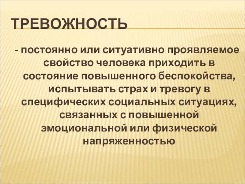 ТРЕВОЖНОСТЬ - постоянно или ситуативно проявляемое свойство человека приходить в состояние повышенного беспокойства, испытывать страх и тревогу