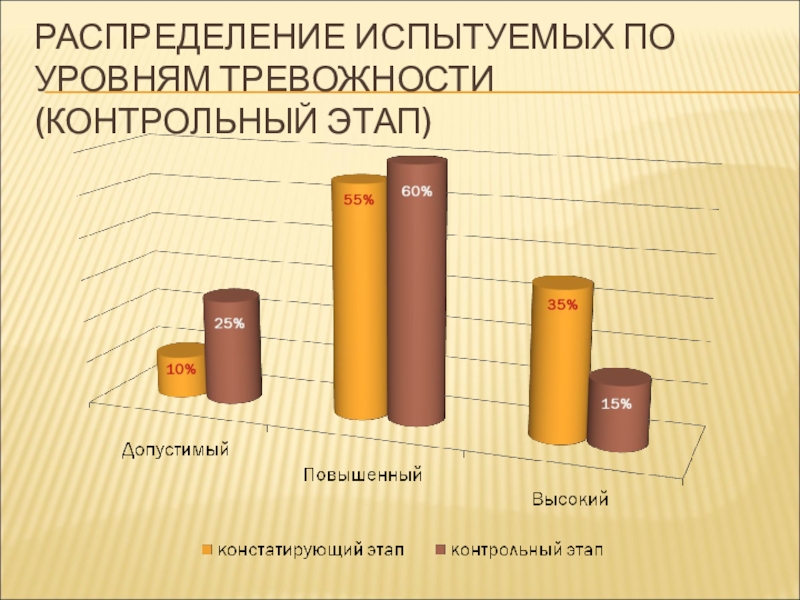 Слайд 14РАСПРЕДЕЛЕНИЕ ИСПЫТУЕМЫХ ПО УРОВНЯМ ТРЕВОЖНОСТИ (КОНТРОЛЬНЫЙ ЭТАП)