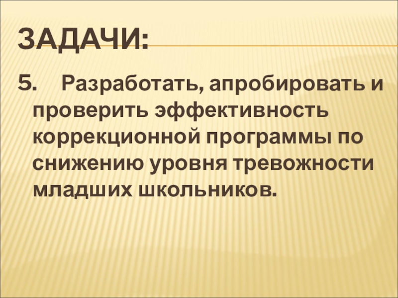 ЗАДАЧИ:5.     Разработать, апробировать и проверить эффективность коррекционной программы по снижению уровня тревожности младших школьников.