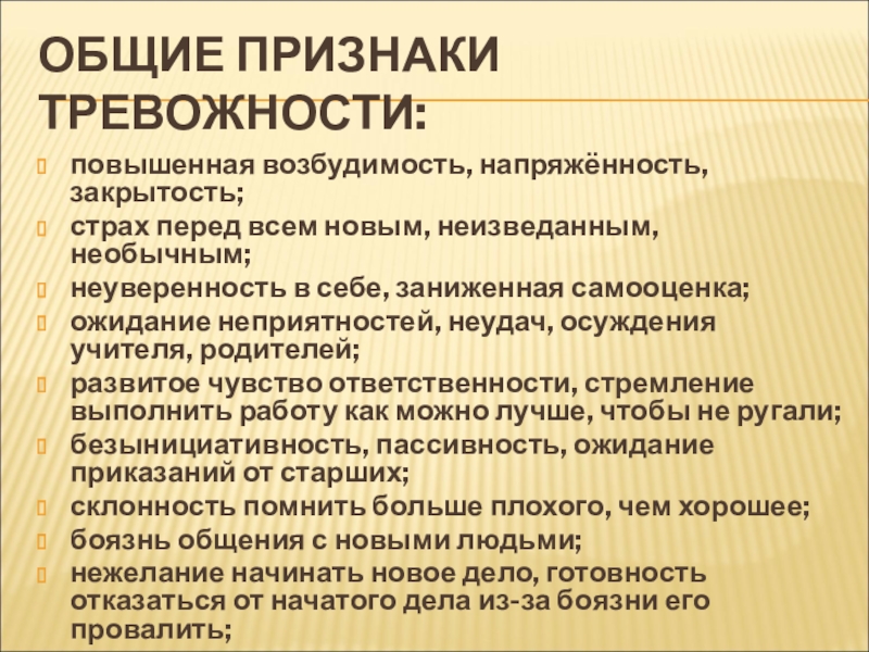 ОБЩИЕ ПРИЗНАКИ ТРЕВОЖНОСТИ:повышенная возбудимость, напряжённость, закрытость;страх перед всем новым, неизведанным, необычным;неуверенность в себе, заниженная самооценка;ожидание неприятностей, неудач,