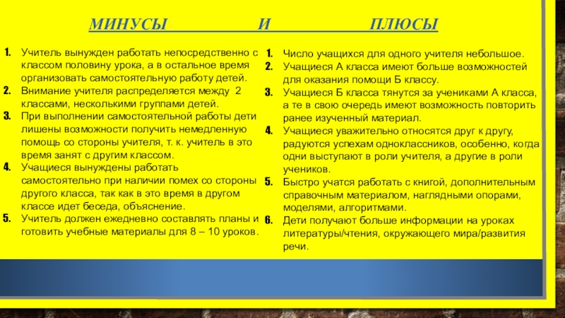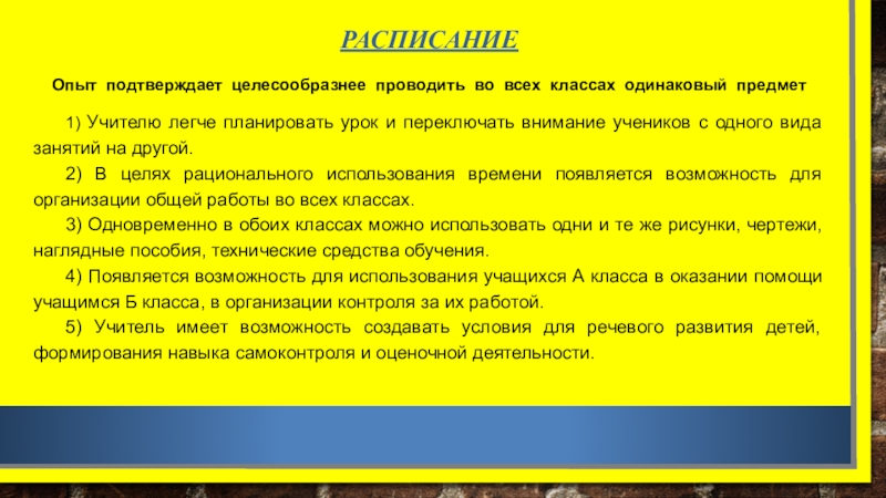 Внимание учителя распределяется между 2 классами, несколькими группами детей.