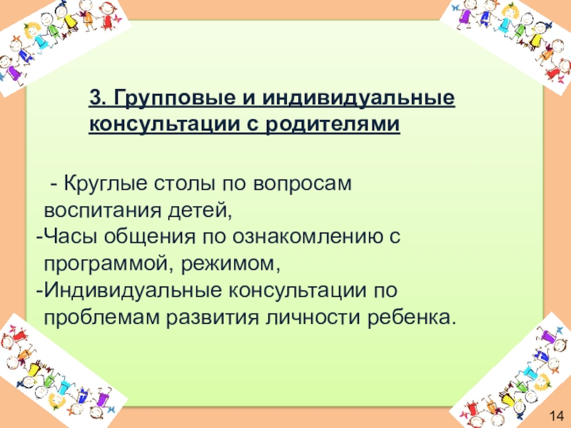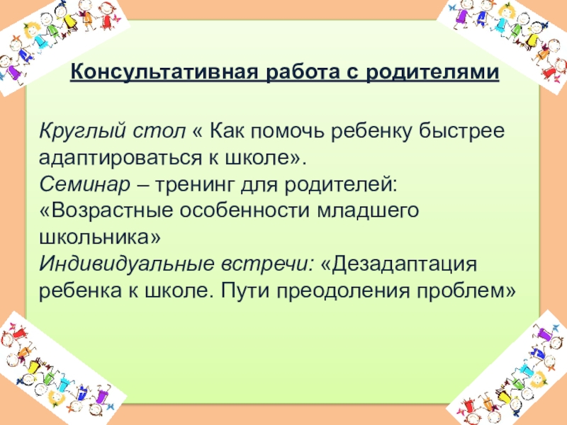 Индивидуальные консультации по проблемам развития личности ребенка.