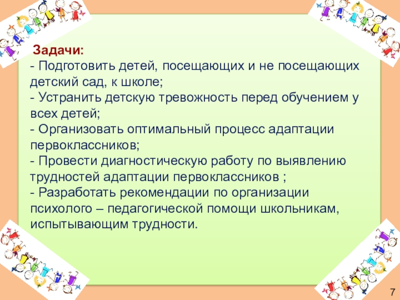 - Провести диагностическую работу по выявлению трудностей адаптации первоклассников ;