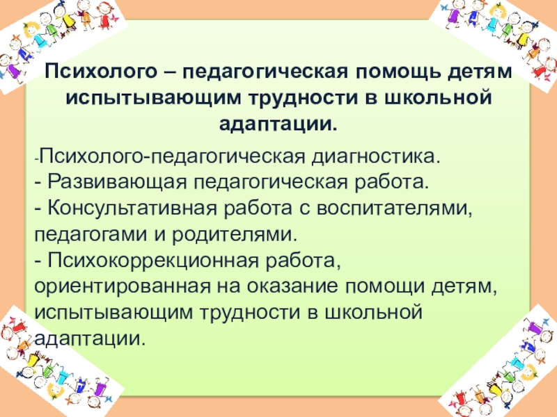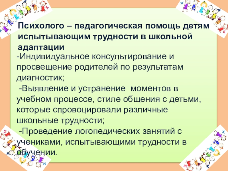 Слайд 24Психолого – педагогическая помощь детям испытывающим трудности в школьной адаптации
