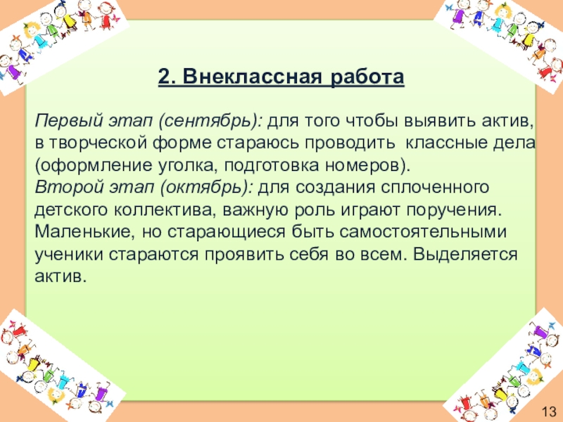 Второй этап (октябрь): для создания сплоченного детского коллектива, важную роль играют поручения. Маленькие, но старающиеся быть самостоятельными ученики стараются проявить себя во всем. Выделяется актив.