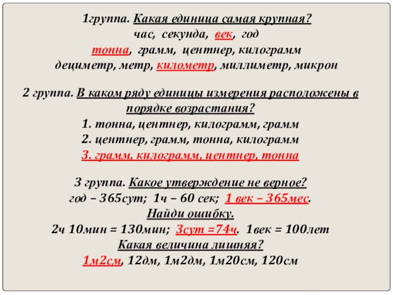 2 группа. В каком ряду единицы измерения расположены в порядке возрастания?