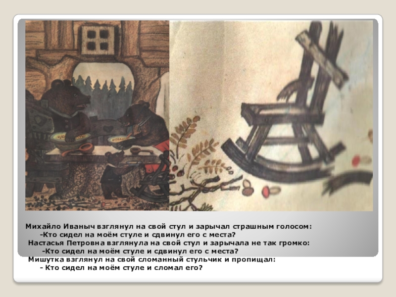 Слайд 10Михайло Иваныч взглянул на свой стул и зарычал страшным голосом: