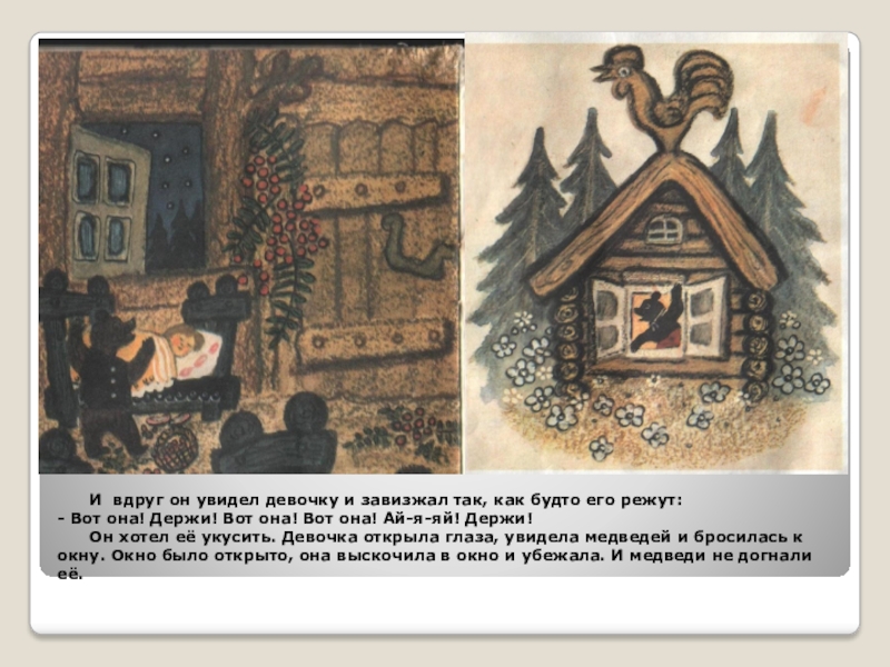 Он хотел её укусить. Девочка открыла глаза, увидела медведей и бросилась к окну. Окно было открыто, она выскочила в окно и убежала. И медведи не догнали её.