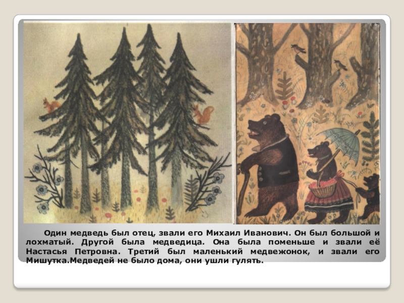 Он был большой и лохматый. Другой была медведица. Она была поменьше и звали её Настасья Петровна. Третий был маленький медвежонок, и звали его Мишутка.Медведей не было дома, они ушли гулять.