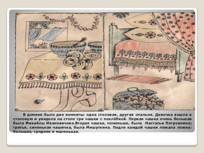 спальня. Девочка вошла в столовую и увидела на столе три чашки с похлёбкой. Первая чашка очень большая была Михайлы Ивановичева.Вторая чашка, поменьше, была Настасьи Петровнина; третья, синенькая чашечка, была Мишуткина. Подле каждой чашки лежала ложка: большая, средняя и маленькая.