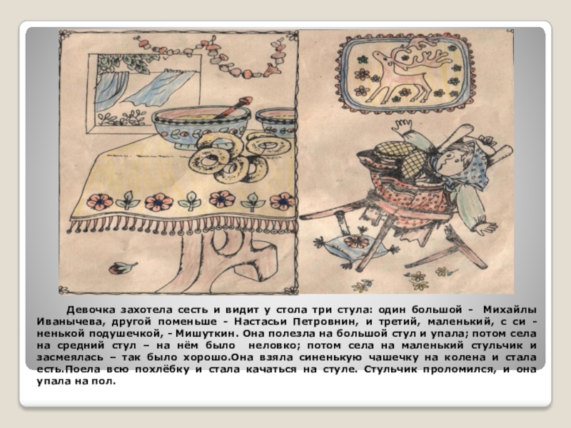 у стола три стула: один большой - Михайлы Иванычева, другой поменьше - Настасьи Петровнин, и третий, маленький, с си -ненькой подушечкой, - Мишуткин. Она полезла на большой стул и упала; потом села на средний стул – на нём было неловко; потом села на маленький стульчик и засмеялась – так было хорошо.Она взяла синенькую чашечку на колена и стала есть.Поела всю похлёбку и стала качаться на стуле. Стульчик проломился, и она упала на пол.