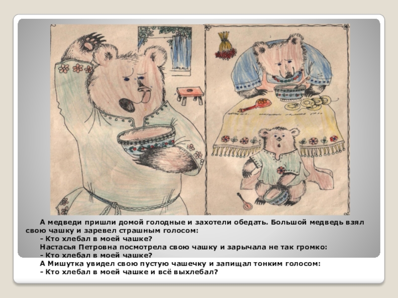 Слайд 9 А медведи пришли домой голодные и захотели обедать.