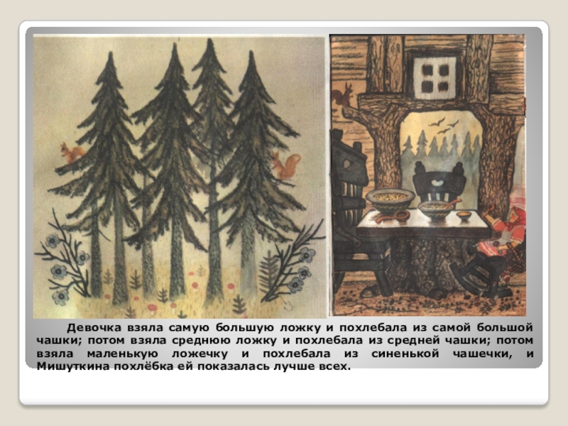 самой большой чашки; потом взяла среднюю ложку и похлебала из средней чашки; потом взяла маленькую ложечку и похлебала из синенькой чашечки, и Мишуткина похлёбка ей показалась лучше всех.