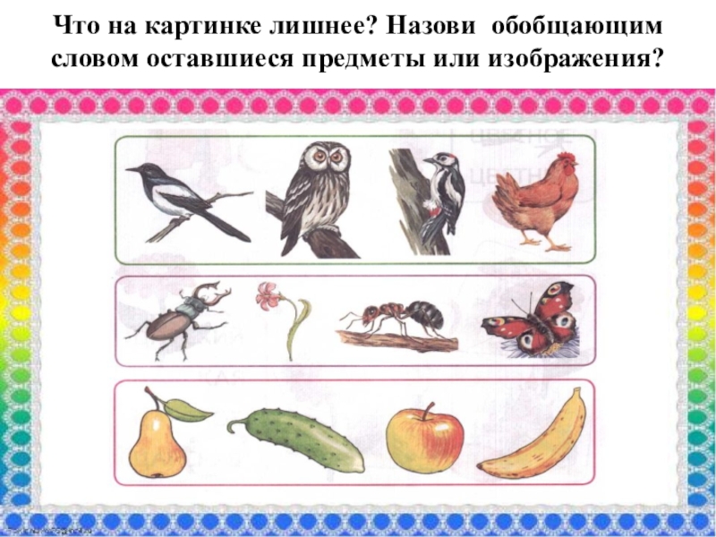 Слайд 17Что на картинке лишнее? Назови обобщающим словом оставшиеся предметы или изображения?
