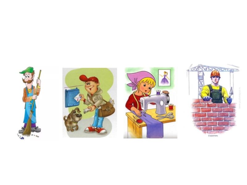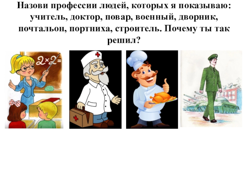Назови профессии людей, которых я показываю: учитель, доктор, повар, военный, дворник, почтальон, портниха, строитель. Почему ты так