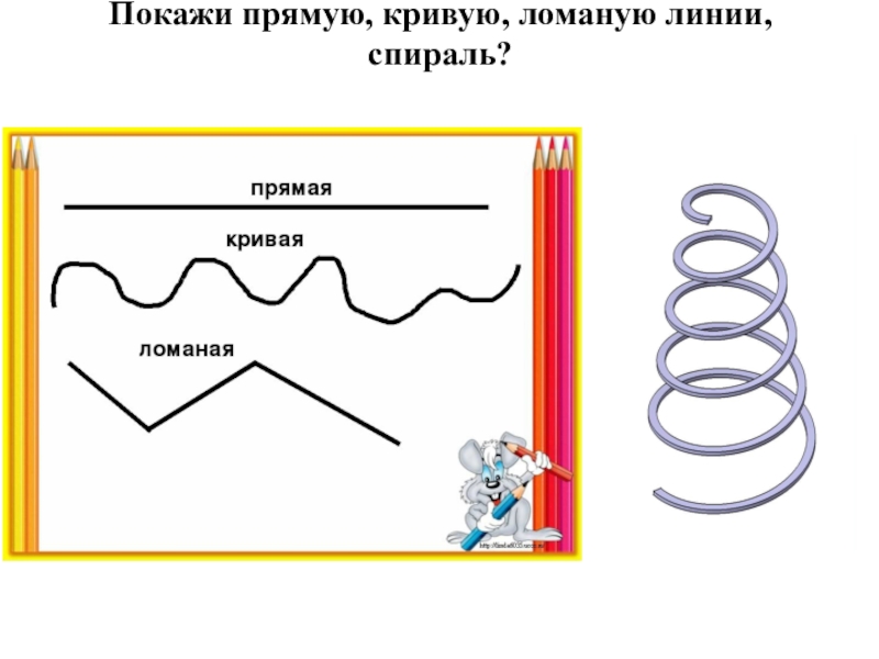 Слайд 18 Покажи прямую, кривую, ломаную линии, спираль?