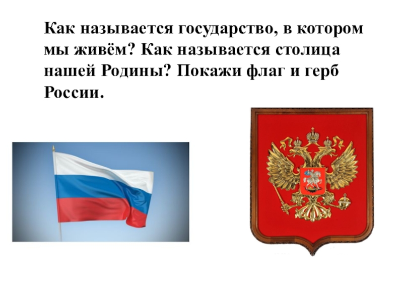 Как называется государство, в котором мы живём? Как называется столица нашей Родины? Покажи флаг и герб России.
