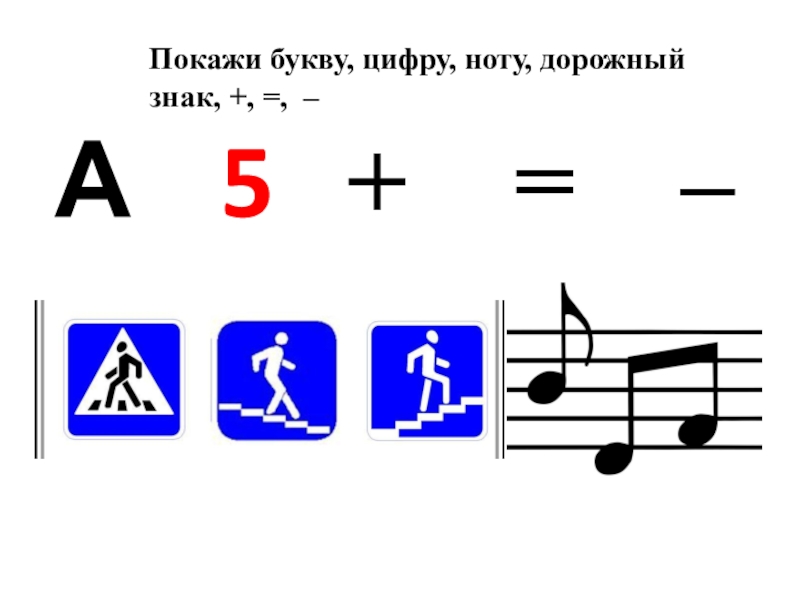 Покажи букву, цифру, ноту, дорожный знак, +, =, – А  5  +  =