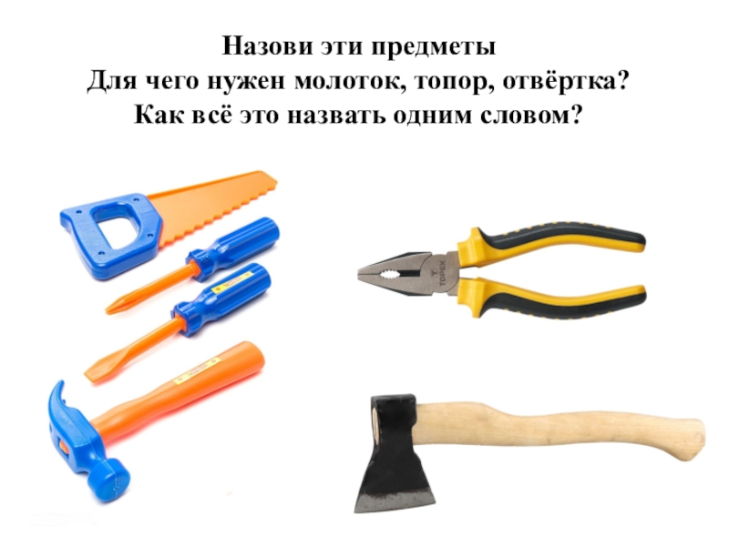 Назови эти предметы Для чего нужен молоток, топор, отвёртка? Как всё это назвать одним словом?
