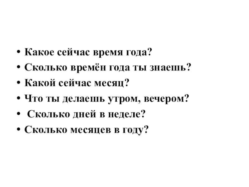 Какое сейчас время года? Сколько времён года ты знаешь? Какой сейчас месяц? Что ты делаешь утром, вечером?