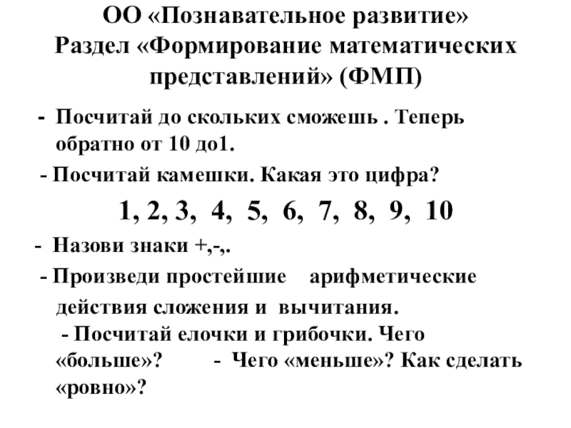 ОО «Познавательное развитие» Раздел «Формирование математических представлений» (ФМП)Посчитай до скольких сможешь . Теперь  обратно от 10