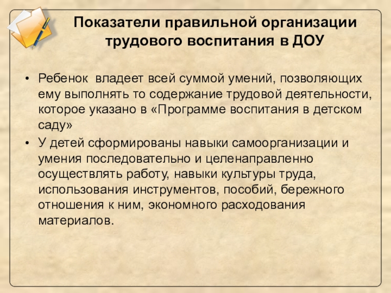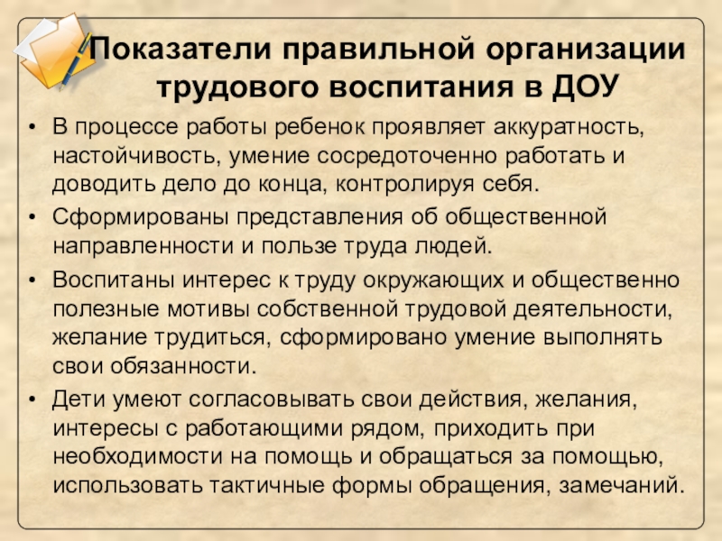 Слайд 14Показатели правильной организации трудового воспитания в ДОУ