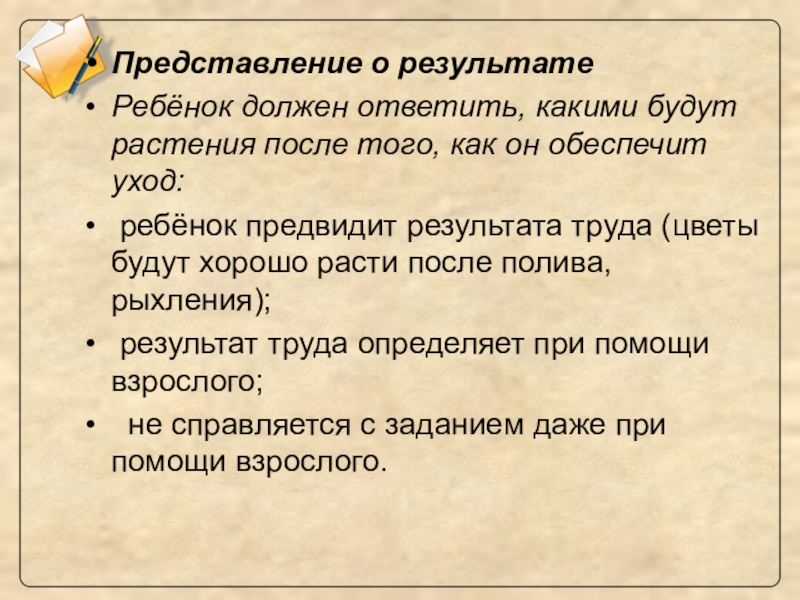 ребёнок предвидит результата труда (цветы будут хорошо расти после полива, рыхления);