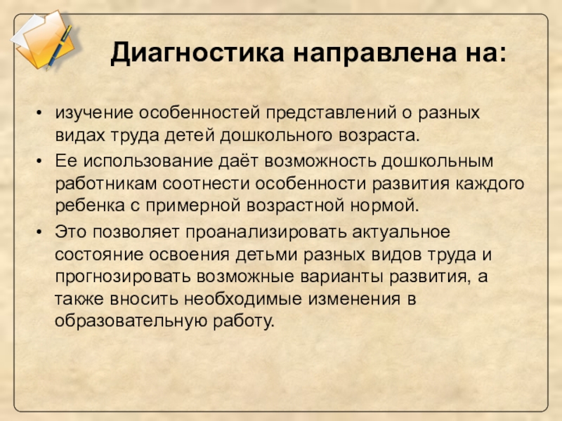 Это позволяет проанализировать актуальное состояние освоения детьми разных видов труда и прогнозировать возможные варианты развития, а также вносить необходимые изменения в образовательную работу.