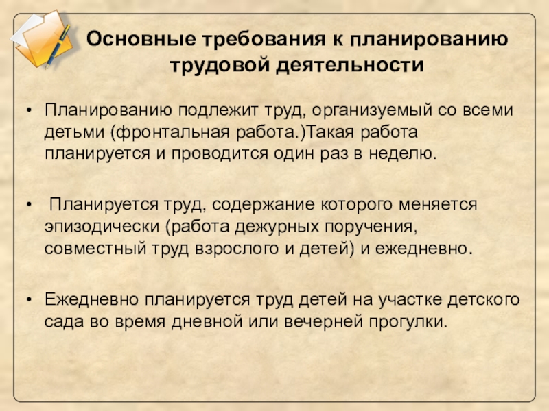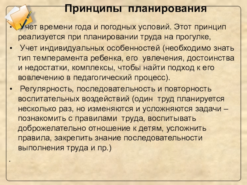 Регулярность, последовательность и повторность воспитательных воздействий (один труд планируется несколько раз, но изменяются и усложняются задачи – познакомить с правилами труда, воспитывать доброжелательно отношение к детям, усложнить правила, закрепить знание последовательности выполнения труда и пр.)
