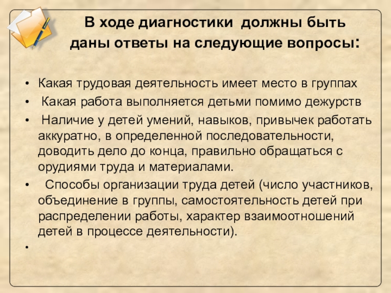 В ходе диагностики должны быть даны ответы на следующие вопросы: