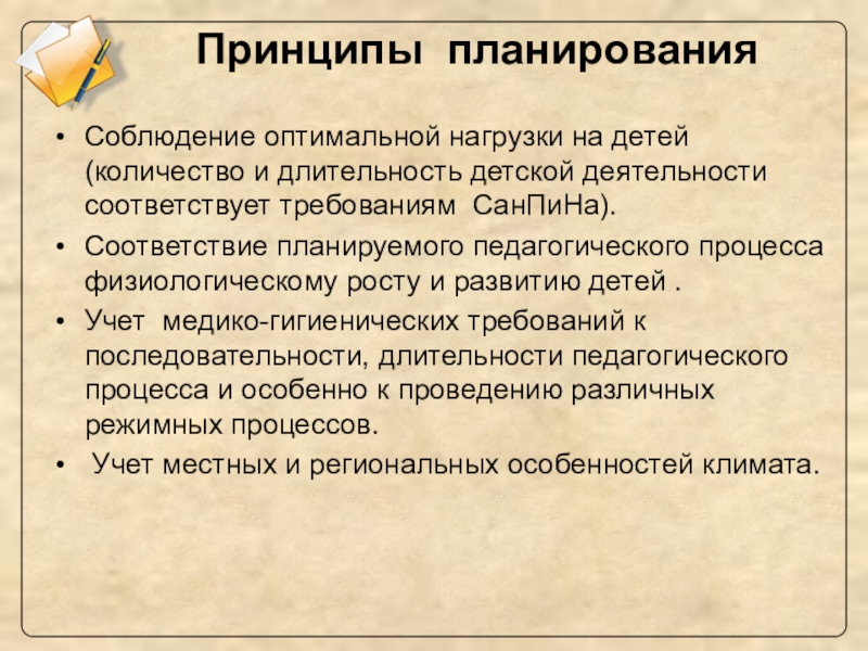 Учет медико-гигиенических требований к последовательности, длительности педагогического процесса и особенно к проведению различных режимных процессов.