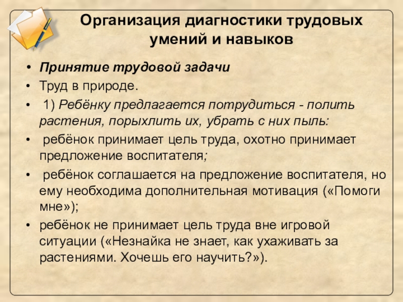 ребёнок не принимает цель труда вне игровой ситуации («Незнайка не знает, как ухаживать за растениями. Хочешь его научить?»).
