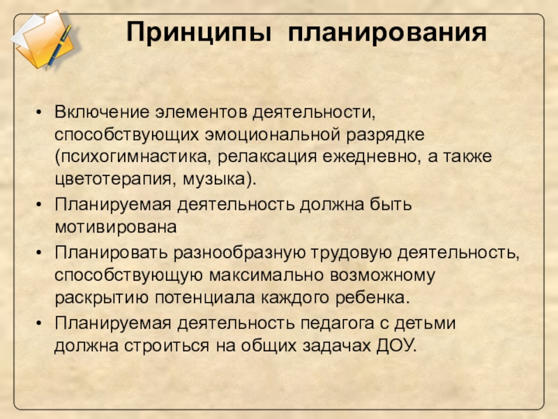 Включение элементов деятельности, способствующих эмоциональной разрядке (психогимнастика, релаксация ежедневно,