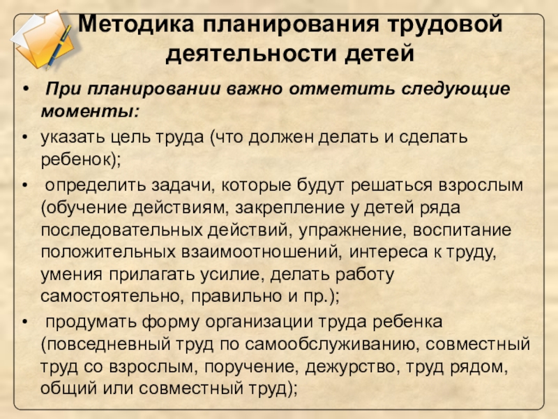 продумать форму организации труда ребенка (повседневный труд по самообслуживанию, совместный труд со взрослым, поручение, дежурство, труд рядом, общий или совместный труд);