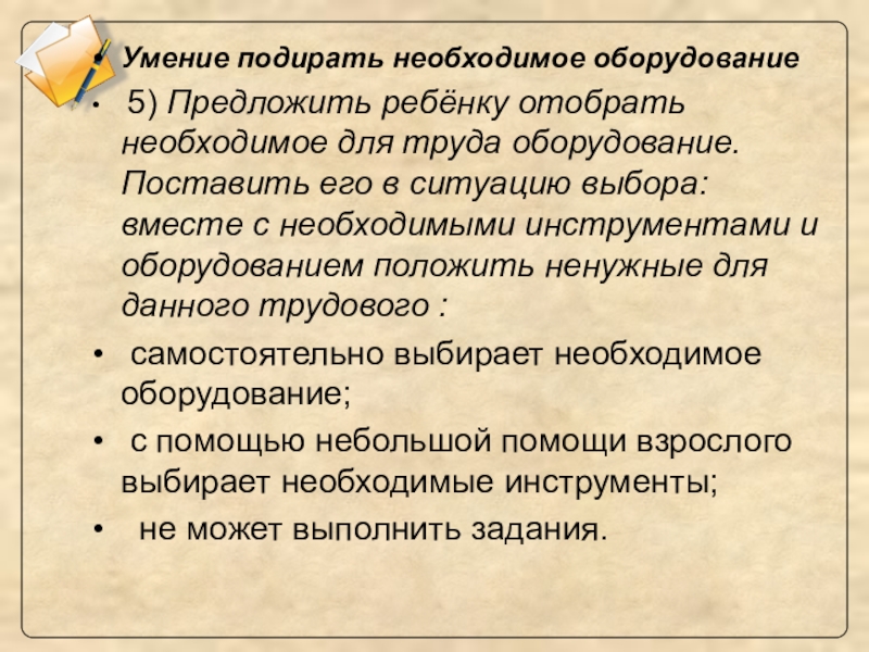 оборудование. Поставить его в ситуацию выбора: вместе с необходимыми инструментами и оборудованием положить ненужные для данного трудового :