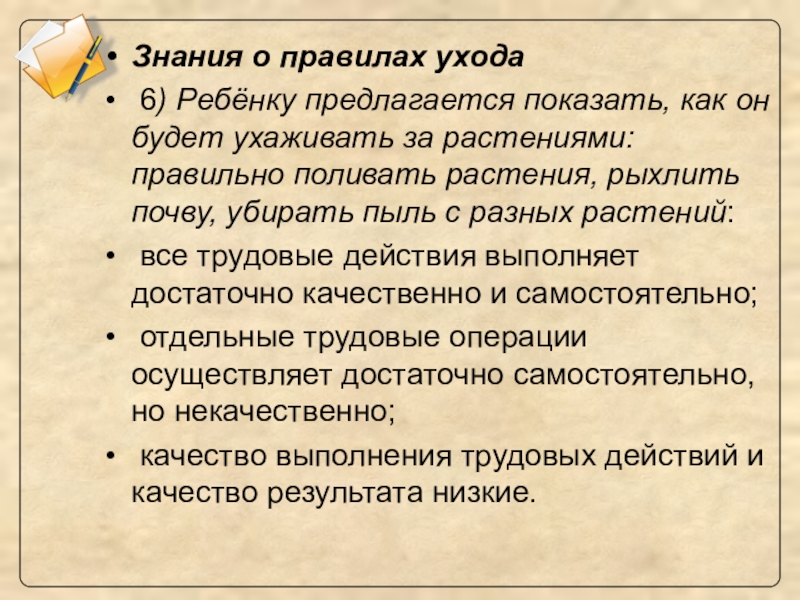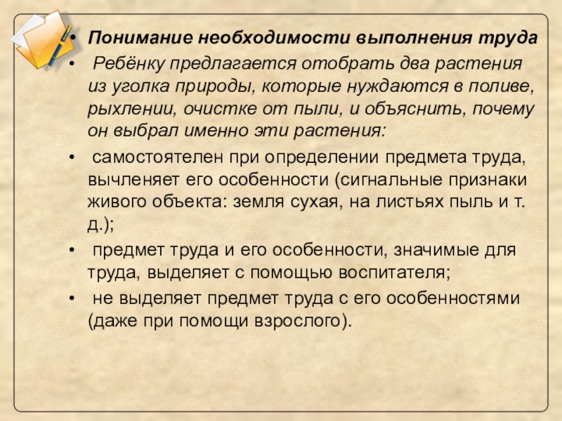 самостоятелен при определении предмета труда, вычленяет его особенности (сигнальные признаки живого объекта: земля сухая, на листьях пыль и т. д.);
