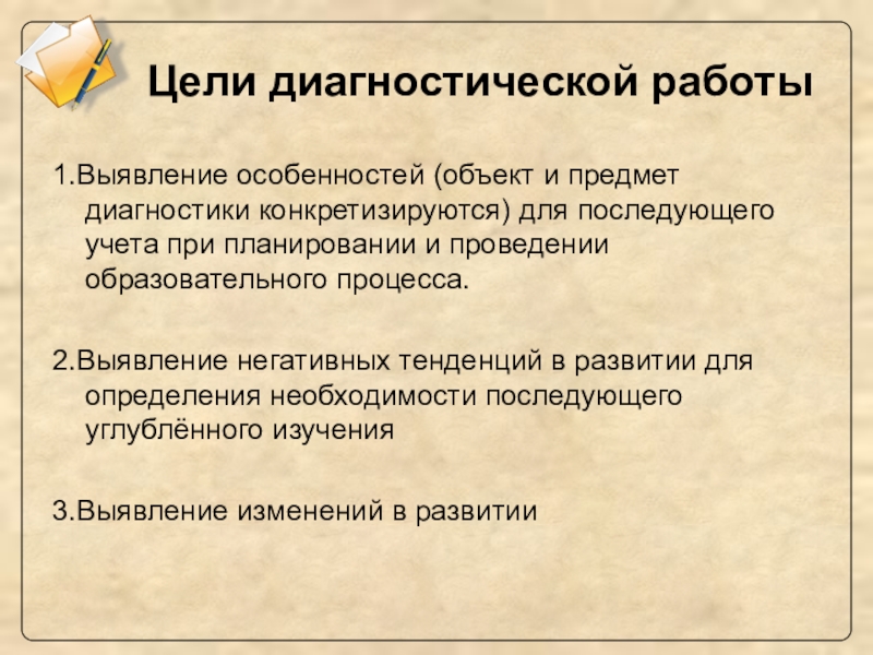 1.Выявление особенностей (объект и предмет диагностики конкретизируются) для