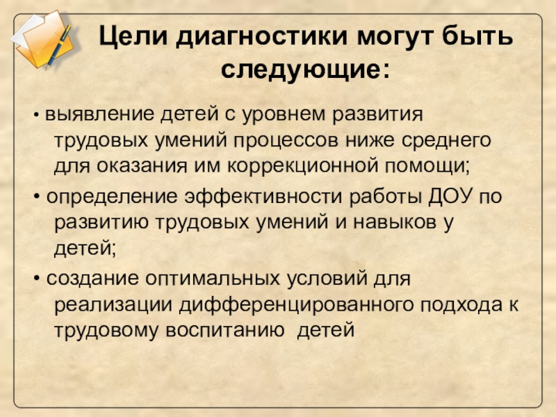 • определение эффективности работы ДОУ по развитию трудовых умений и навыков у детей;