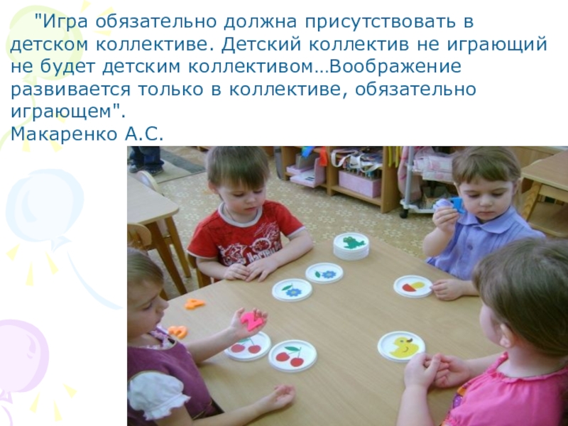 не будет детским коллективом…Воображение развивается только в коллективе, обязательно играющем". Макаренко А.С.