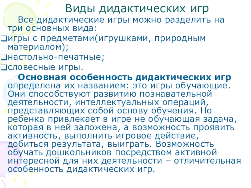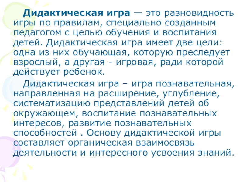 Дидактическая игра – игра познавательная, направленная на расширение, углубление, систематизацию представлений детей об окружающем, воспитание познавательных интересов, развитие познавательных способностей . Основу дидактической игры составляет органическая взаимосвязь деятельности и интересного усвоения знаний.