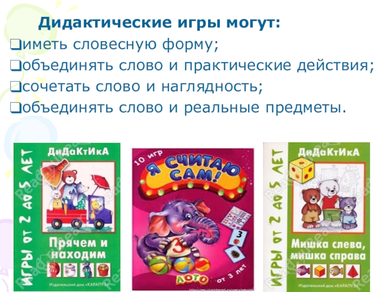 Основная особенность дидактических игр определена их названием: это игры обучающие. Они способствуют развитию познавательной деятельности, интеллектуальных операций, представляющих собой основу обучения. Но ребенка привлекает в игре не обучающая задача, которая в ней заложена, а возможность проявить активность, выполнить игровое действие, добиться результата, выиграть. Возможность обучать дошкольников посредством активной интересной для них деятельности – отличительная особенность дидактических игр.