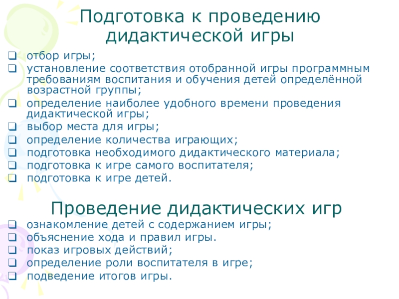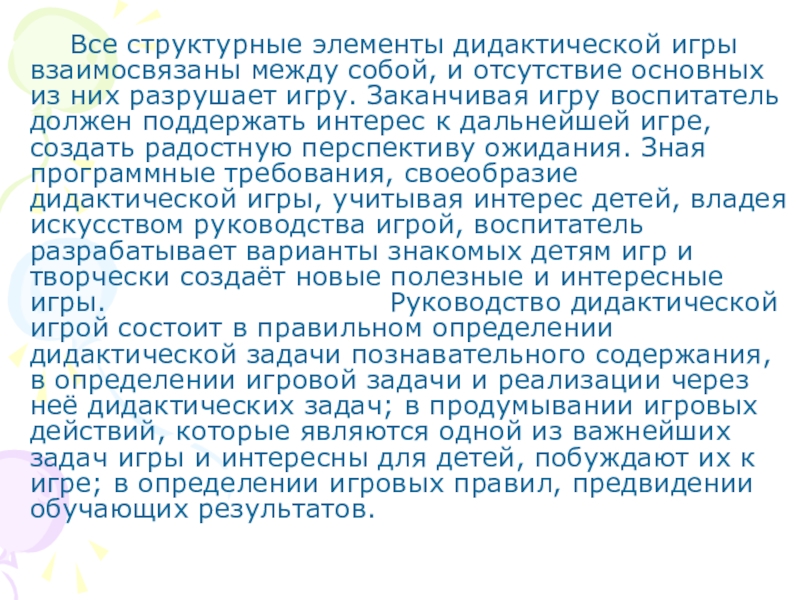 из них разрушает игру. Заканчивая игру воспитатель должен поддержать интерес к дальнейшей игре, создать радостную перспективу ожидания. Зная программные требования, своеобразие дидактической игры, учитывая интерес детей, владея искусством руководства игрой, воспитатель разрабатывает варианты знакомых детям игр и творчески создаёт новые полезные и интересные игры. Руководство дидактической игрой состоит в правильном определении дидактической задачи познавательного содержания, в определении игровой задачи и реализации через неё дидактических задач; в продумывании игровых действий, которые являются одной из важнейших задач игры и интересны для детей, побуждают их к игре; в определении игровых правил, предвидении обучающих результатов.
